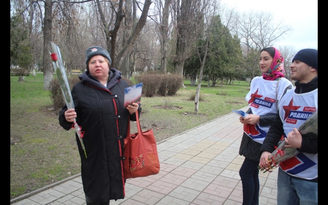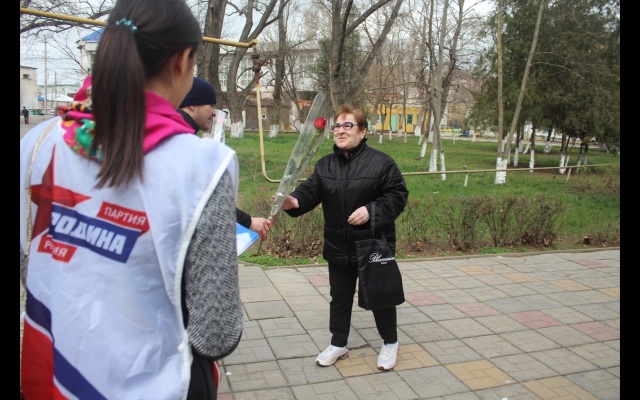 Из рук партийцев представительницы прекрасного пола получали цветы и открытки. Польщенные вниманием к себе женщины не скрывали эмоций и благодарили ребят за поздравления.